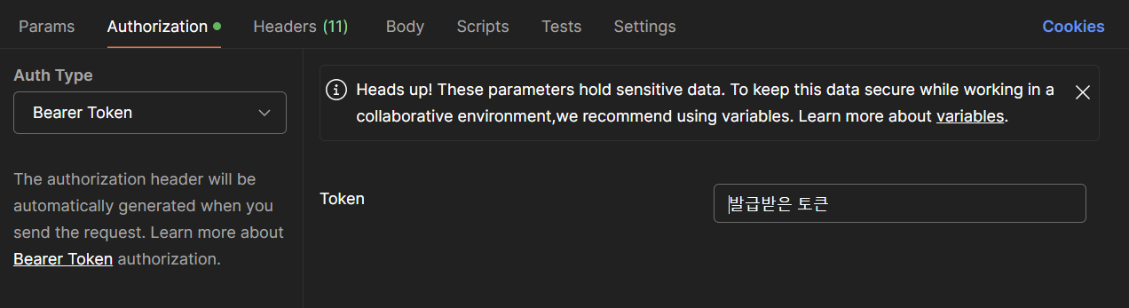 Authorization에서 Auth Type을 선정 후 발급받은 토큰을 넣어서 요청을 보내면 된다.